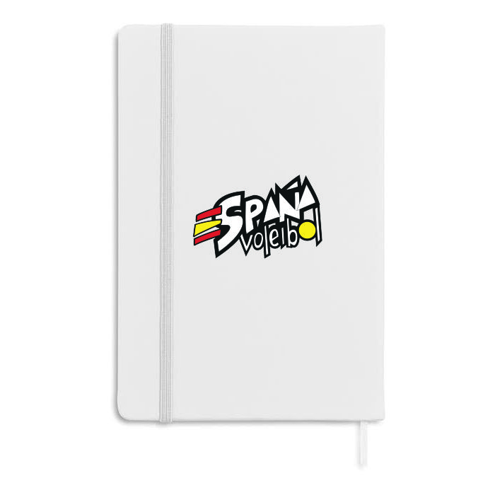 Libreta de tamaño A5, papel pautado con rayas, con impresión en portada y contraportada.